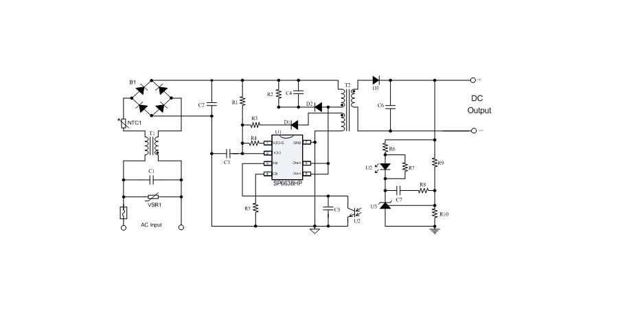 SP6638HP是一顆電流模式PWM控制芯片,內置功率MOSFET,用于功率在27W以內的方案。該芯片在系統輸出空載時工作在跳頻模式,在系統輸出輕載到中等負載階段工作在PFM模式,在輸出重載時工作在最大恒定工作頻率。SP6638HP的啟動電流和工作電流設定的比較小,以此減小待機時的功耗。芯片內置有斜坡補償電路,避免次諧波振蕩的發生,改善系統的穩定性。芯片內置有前沿消隱時間(Leading-edge blanking time),消除緩沖網絡中的二極管反向恢復電流對電路的影響。該芯片帶有抖頻功能,能夠有效改善系統的EMI性能。芯片最低的工作頻率設置在音頻以上,在工作時可以避免系統產生噪音。SP6638HP內置多種保護,包括逐周期限流保護(OCP),過壓保護(OVP),VDD過壓箝位,欠壓保護(UVLO),過溫保護(OTP)等,通過內部的圖騰柱驅動結構可以更好的改善系統的EMI特性和開關的軟啟動控制。SP6638HP使用DIP7無鉛封裝。