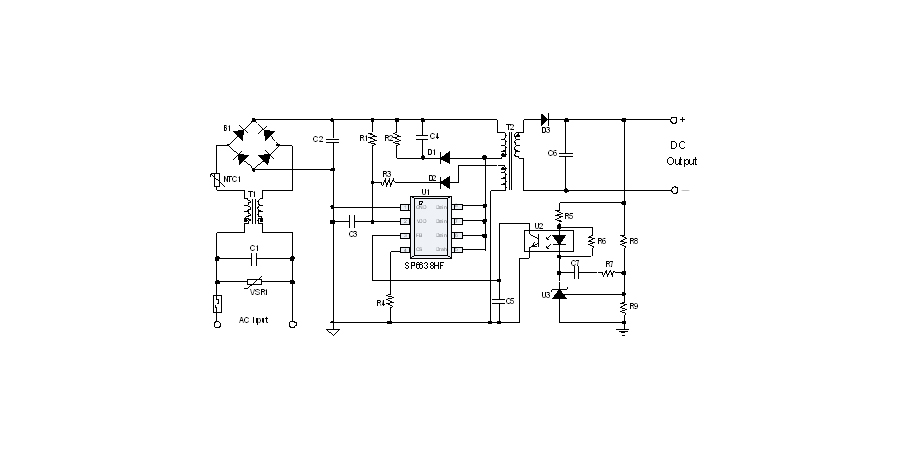 SP6638HF是一顆電流模式PWM控制芯片,內置功率MOSFET,用于功率在18W以內的方案。該芯片在系統(tǒng)輸出空載時工作在跳頻模式,在系統(tǒng)輸出輕載到中等負載階段工作在PFM模式,在輸出重載時工作在最大恒定工作頻率。SP6638HF的啟動電流和工作電流設定的比較小,以此減小待機時的功耗。芯片內置有斜坡補償電路,避免次諧波振蕩的發(fā)生,改善系統(tǒng)的穩(wěn)定性。芯片內置有前沿消隱時間(Leading-edge blanking time),消除緩沖網(wǎng)絡中的二極管反向恢復電流對電路的影響。該芯片帶有抖頻功能,能夠有效改善系統(tǒng)的EMI性能。芯片最低的工作頻率設置在音頻以上,在工作時可以避免系統(tǒng)產生噪音。SP6638HF內置多種保護,包括逐周期限流保護(OCP),過壓保護(OVP),VDD過壓箝位,欠壓保護(UVLO),過溫保護(OTP)等,通過內部的圖騰柱驅動結構可以更好的改善系統(tǒng)的EMI特性和開關的軟啟動控制。SP6638HF使用SOP8無鉛封裝。