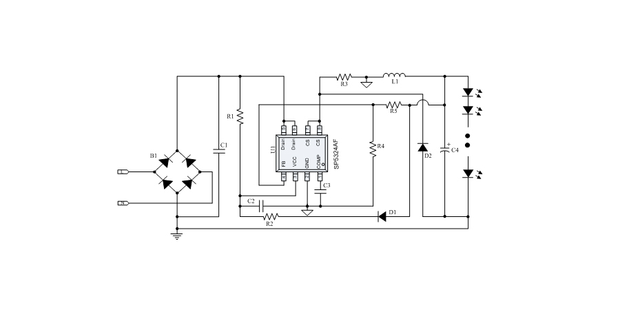 SP5324AF是一款非隔離降壓型單級PFC高性能LED照明轉換電路,內置550V高壓MOSFET,具有應用外圍器件極少,設計簡單,功率因數高,恒流精度高等優點。采用準諧振開啟的控制方式,提升了轉換效率。外圍應用采用浮地架構,實現對電感電流進行全周期采樣,得到極高的恒流精度。
