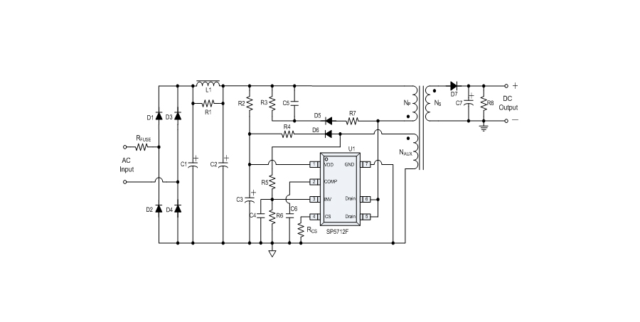 SP5712是一顆高精度離線式開(kāi)關(guān)電源電路,應(yīng)用于低功耗AC/DC充電器與適配器。SP5712使用原邊取樣來(lái)進(jìn)行精確的恒流、恒壓控制,可以省去一般應(yīng)用中的光耦與TL431。