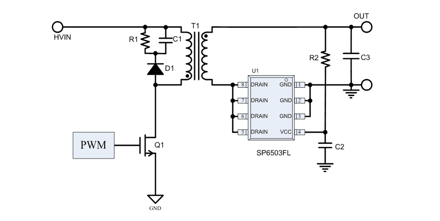 SP6503FL檢測(cè)內(nèi)置MOSFET的導(dǎo)通電阻(Rds-on)上的壓降,來控制MOSFET的開關(guān)。應(yīng)用外圍簡(jiǎn)單。適用于5V輸出的應(yīng)用方案。