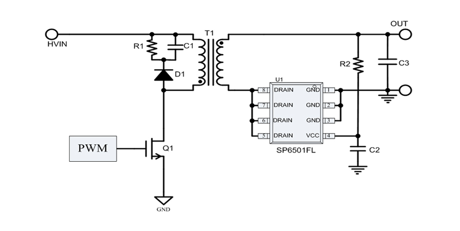SP6501FL是一顆應用于隔離反激電源系統的次級同步整流芯片。通過模擬次級肖特基整流二極管的工作并以極低的導通電阻來減小損耗。SP6501FL可以工作在斷續模式(DCM)和準諧振模式(QR)。使用先進的消隱技術使得芯片在各種工作模式下可以穩定可靠地工作。