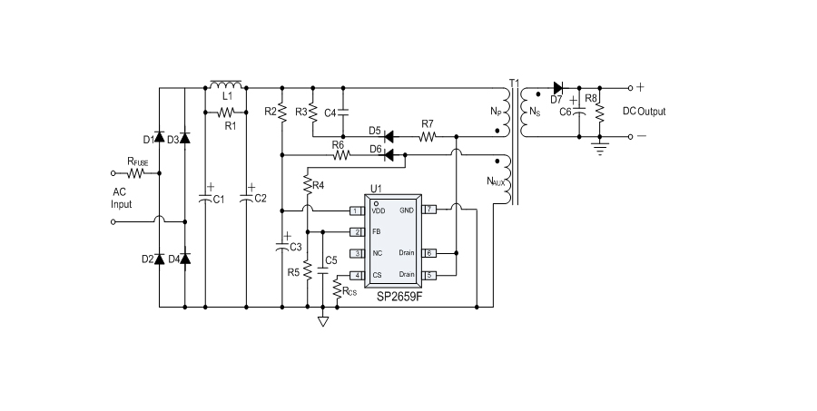 SP2659F是一款性能優異的原邊反饋控制電路,應用于小功率AC/DC充電器與適配器。控制電路使用原邊采樣技術進行精確的恒流、恒壓控制,可以省去一般應用中的光耦與TL431。