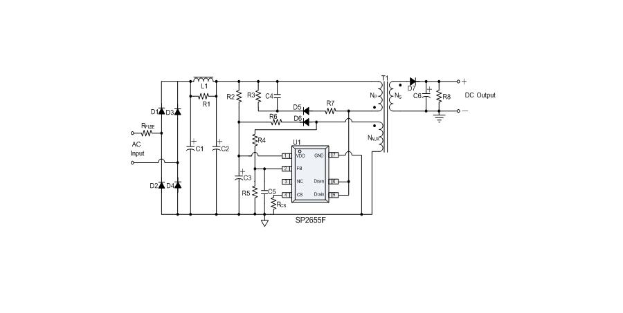 SP2655 提供全面的保護(hù)功能,包括逐周期限流保護(hù)(OCP)、VDD 過壓保護(hù)(OVP)、VDD 欠壓保護(hù)(UVLO)、反饋環(huán)路開路保護(hù)、輸出短路保護(hù)、輸出過壓保護(hù)、過溫保護(hù)等。其中,輸出短路保護(hù)、輸出過壓保護(hù)具有自動(dòng)重啟恢復(fù)的功能。